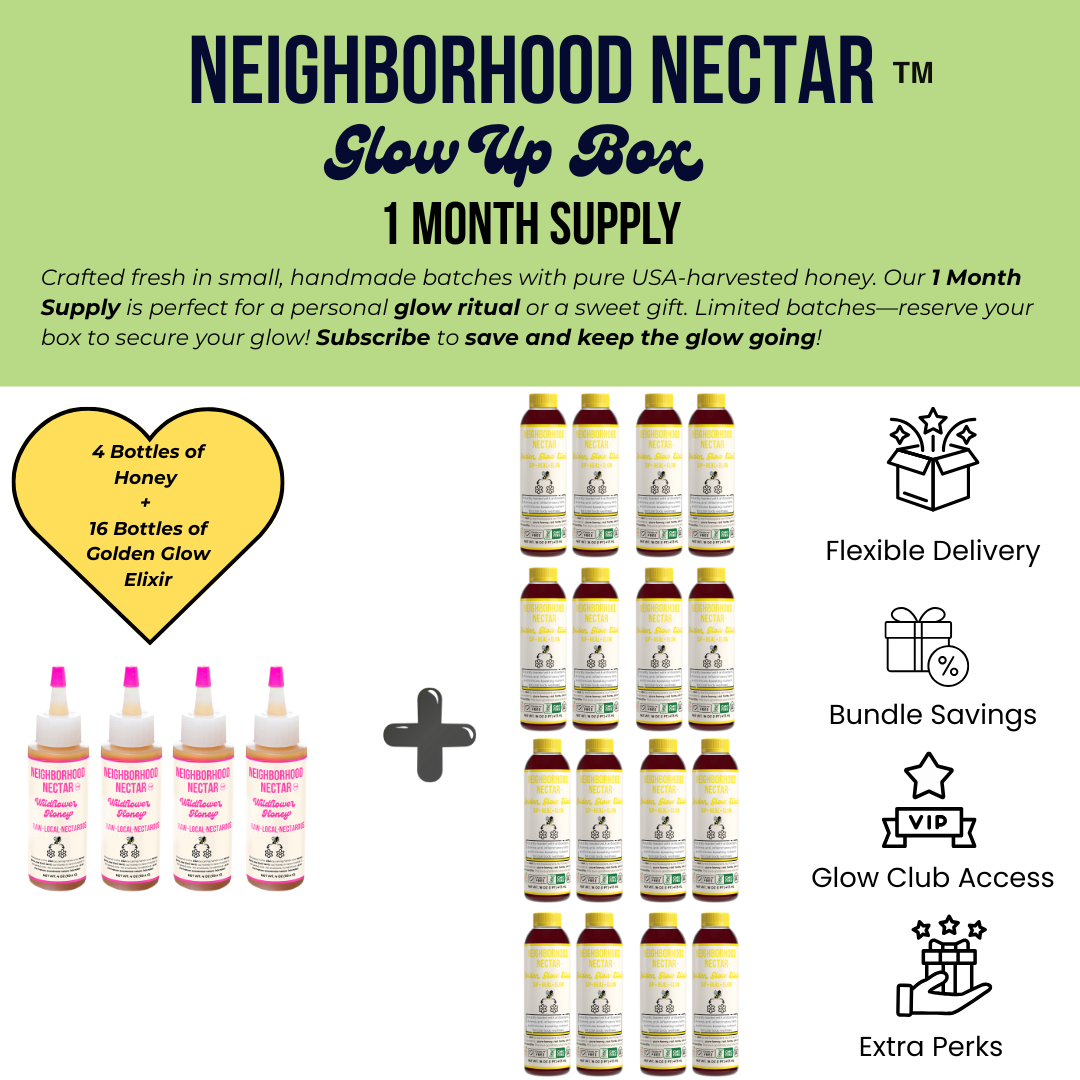Crafted fresh in small, handmade batches with pure USA‑harvested honey. Our 1 Month Supply is perfect for a personal glow ritual or a sweet gift. Limited batches—reserve your box to secure your glow! Subscribe to save and keep the glow going!