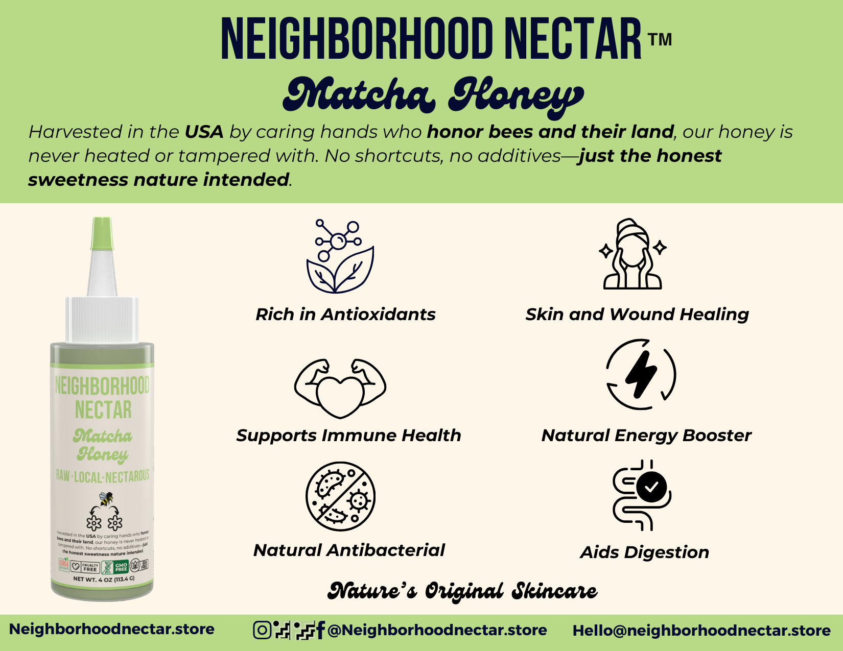 At Neighborhood Nectar™, we believe skincare should be simple, effective, and rooted in nature. Matcha Honey is made with raw, unfiltered honey that is gently whipped to a smooth, velvety texture and never heated. This preserves the natural enzymes, antioxidants, and antibacterial properties your skin benefits from. Infused with vibrant matcha, it becomes a nourishing ritual for calm, clear, glowing skin. Here is what makes it different: